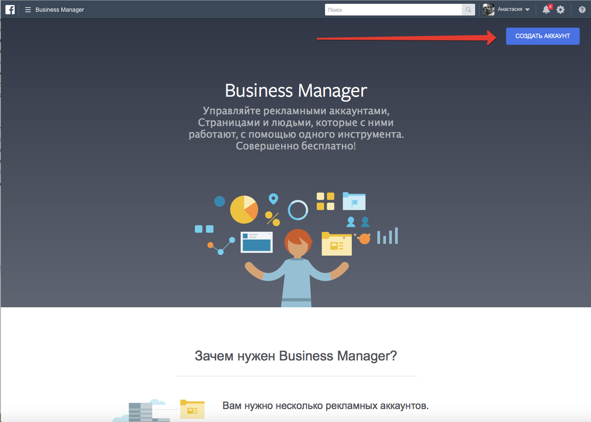 https://business.facebook.com/overview Далее заполняем формы корректными данными. Далее нужно зайти в настройки раскрыв меню в верхнем левом углу и перейдя в "настройки компании" Далее выбираем "рекламные аккаунты" и создаем рекламный аккаунт.