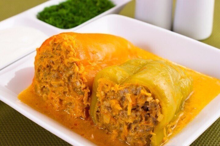 Фаршированный перец Самые вкусные Ингредиенты: -8–10 шт. болгарского перца -400 г фарша (любого, по вкусу) -200 г отварного риса -150 г сметаны -150 г томатной пасты или кетчупа -200 г моркови -200 г лука -соль -перец -растительное масло Приготовление: Лук мелко нарезать. Морковь натереть на мелкой терке. Половину лука обжарить на растительном масле. Добавить половину моркови, обжарить. Смешать фарш и рис. Добавить обжаренные морковь и лук, посолить, поперчить, хорошо перемешать. У перца отрезать верхушку, удалить семена. Перец наполнить фаршем. Смешать сметану и томатную пасту. В кастрюльке смешать оставшиеся лук, морковь. Добавить сметанно-томатный соус, перемешать. Выложить перцы. Налить воду так, чтобы она доходила до середины перцев. Тушить на среднем огне, под крышкой, около 40 минут. Подавать со сметаной или с соусом, в котором тушились перцы. Приятного аппетита!
