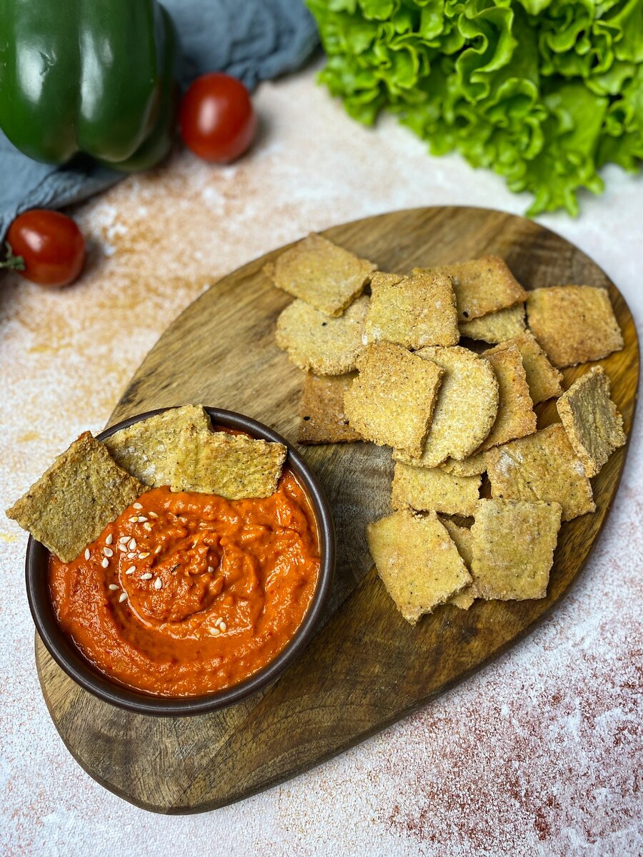 Предлагаем приготовить это постное печенье, которое станет отличным выбором, если вы любите похрустеть. Крекеры получаются очень хрустящими и без явного бобового привкуса. В сочетании с ароматнейшим соусом из сладкого перца, который мы также рекомендуем приготовить, получается действительно отличная закуска! Радует то, что это печенье готовится без яиц, без молока и без сливочного масла, а значит является веганским на 100% (vegan)! Ах, еще эта выпечка и без глютена. Ингредиенты: Крекеры: Пряный соус: Для второго варианта крекеров: Итого ~205 рублей на порцию крекеров, которой смело хватит на двоих. Если заменить безглютеновую муку на пшеничную белую, выйдет дешевле :) Приготовление: Для начала приготовим соус к крекерам 1. Нарезаем крупно все овощи для соуса: лук, чеснок, перец чили, болгарский перец и помидоры черри. 2. В небольшом количестве растительного масла обжариваем до мягкости лук, чеснок и перец чили. Затем добавляем остальные овощи и обжариваем всё вместо до мягкости всех