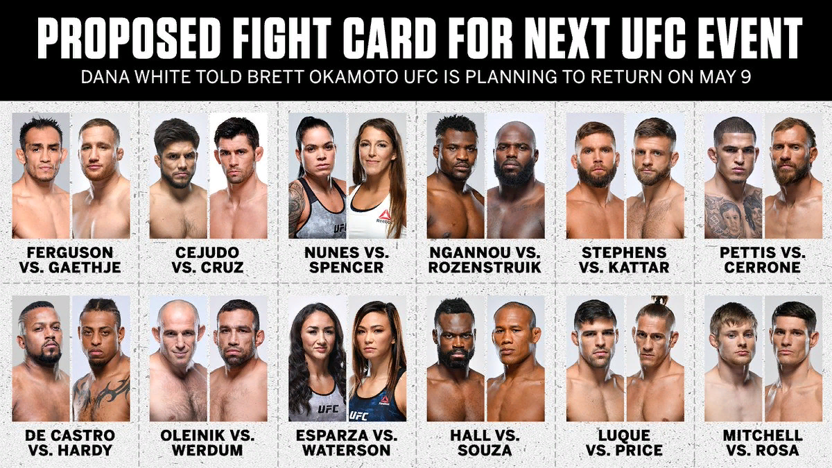 Стало известно что ufc пройдёт 9 мая о точного места не известно. Мы вием много крутых боёв Петим vs Серона, Нгану vs Розенструйк и тд. Русский боец Алексей Олейник . Это не бой хабиба с тони но что то. Они будут драться за временный титул.