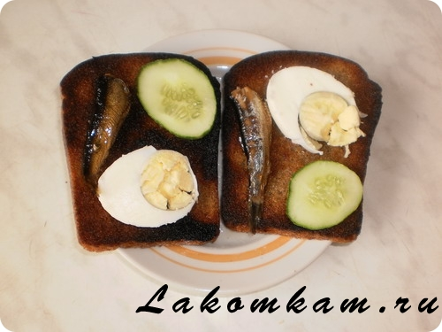 Бутерброды «Именины у русалки». Ингредиенты: половинка ржаного хлеба; 1 свежий огурец; 2 яйца; банка шпрот.