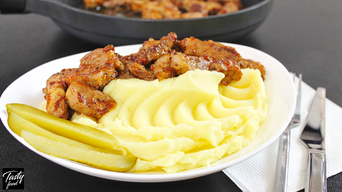 Предлагаю рецепт, как вкусно приготовить кусочки мяса без его маринования. А на гарнир картофельное пюре.