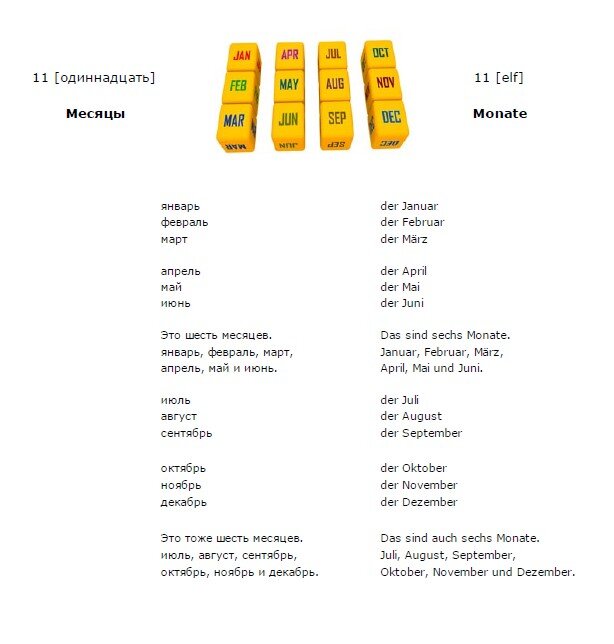 Немецкий язык. Урок 1. Немецкий язык. Урок 10. Добрый день! Продолжим изучение немецкого языка. Немецкий язык. Урок 11. 11 (одиннадцать) - 11 (elf) Месяцы - Monate январь - der Januar февраль - der Februar март - der März апрель - der April май - der Mai июнь - der Juni Это шесть месяцев. - Das sind sechs Monate. январь, февраль, март, - Januar, Februar, März, апрель, май и июнь. - April, Mai und Juni. июль - der Juli август - der August сентябрь - der September октябрь - der Oktober ноябрь - der November декабрь - der Dezember Это тоже шесть месяцев. - Das sind auch sechs Monate. июль, август, сентябрь, - Juli, August, September, октябрь, ноябрь и декабрь. - Oktober, November und Dezember. Видео для тренировки произношения: Немецкий язык. Урок 12.