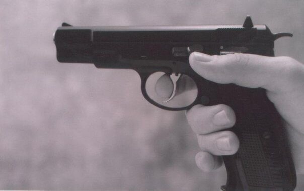 5.С поджатием среднего пальца в момент срыва курка - способ рассчитан на ведение скоростной стрельбы и противодействие отдаче. Обработка спуска может производится любым из вышеперечисленных способов. Не так труден в овладении, как полагает большинство специалистов. А многим этот способ вообще неизвестен. Дело в том, что при срыве курка с боевого взвода, средний палец рефлекторно прижимается к рукоятке немного сильнее. Многие авторы настаивают на отработке неподвижности этого пальца во время обработки спуска из-за того, что его движение смещает пистолет. Однако избавится от такого движения среднего пальца ничуть не легче, чем направить это движение строго в вертикальной плоскости, как это необходимо для успешной стрельбы. Этот способ также компенсирует задирание ствола пистолета при срыве курка с боевого взвода. Если вам хватит настойчивости, следует обязательно овладеть этим приемом и довести его до автоматизма. Но для спортивной стрельбы этот способ не подходит категорически! (фото 5)