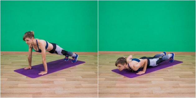 Это универсальное упражнение для прокачки трицепсов и грудных мышц. Старайтесь сразу выполнять отжимания правильно: локти находятся под углом 45 градусов, пресс и ягодицы напряжены, а тело представляет собой прямую линию.Если вы не можете выполнить полное отжимание в упоре лёжа, поставьте ноги на колени. Бывает так, что на ногах вам отжиматься сложно, а на коленях — слишком просто. В таком случае выполняйте в упоре лёжа столько отжиманий, сколько сможете с правильной техникой, а затем переходите на колени.В отжиманиях с широкой постановкой рук акцент смещается на грудные мышцы, а трицепсы получают меньше нагрузки.