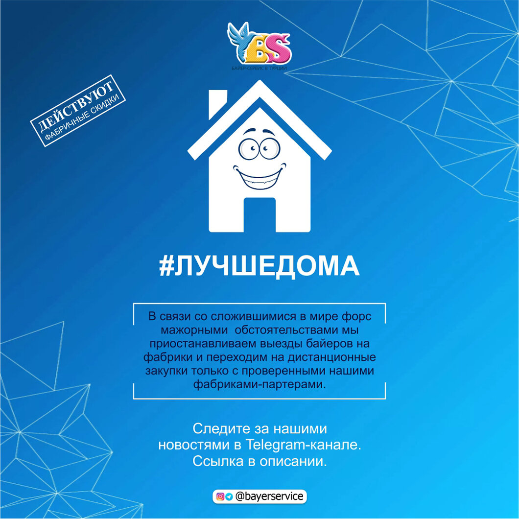 В связи со сложившимися в мире форсмажорными обстоятельствами мы приостанавливаем выезды байеров на фабрики и переходим на дистанционные закупки только с проверенными нашими фабриками-партнерами. Список фабрик имеется у ваших персональных байеров. Приятных закупок. О возобновлении видеозвонков с фабрик мы сообщим на данном канале. Рекомендуем следить за нашими новостями. Ознакомиться с условиями сотрудничества, а также задать интересующие вас вопросы можно по адресу http://taplink.cc/bayerservice