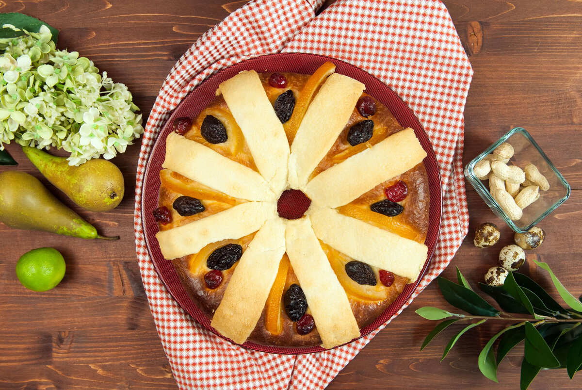 вода Способ приготовления: 1. В деже соединяем 30 г яйц, 250 г пшеничной сильной муки, 5 г соли, 50 г свежих дрожжей и 50 г сахарного песка. Взбиваем в миксере насадкой крюк. Поэтапно вливаем 100 мл молока. 2. Затем постепенно добавляем 60 г сливочного масла. Добавляем цедру 1 апельсина и цедру 1 лимона. Взбиваем в миксере ещё 1 минуту. Готовое тесто отправляем в миску, накрываем пищевой плёнкой и отставляем расстаиваться при комнатной температуре. 3. В деже соединяем 70 г пшеничной муки, 70 г сахарного песка и 70 г сливочного масла. Взбиваем в миксере насадкой лопатка. Полученную массу раскатываем в тонкий прямоугольник между двумя листами пекарской бумаги. Затем отправляем в холодильник. 4. Из теста формуем шарик. Делаем в середине отверстие и аккуратно растягиваем в форму кольца. 5. Противень смачиваем водой, сверху кладём пекарскую бумагу. В заготовку из теста прячем фигурку и перекладываем на противень. Смазываем основу яйцом с солью. Отправляем в духовку на расстойку на 1,5 часа.