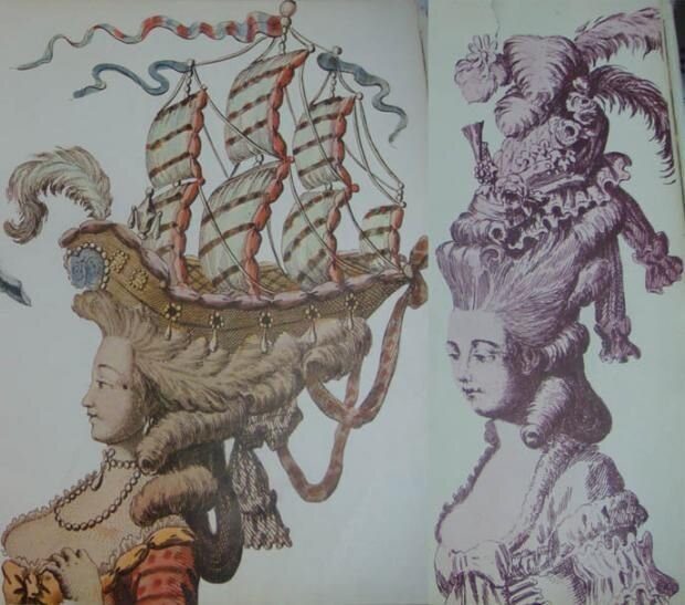 Торжественный спуск на воду королевского фрегата «Адмирал» привел к появлению прически «адмиральская» с корабликом под парусами на макушке. А промчавшаяся в 1773 году по парижскому небу комета породила прическу «комета» с длинным хвостом из хлопчатобумажного газа. Когда в моду вошли живые цветы, в прически стали прятать флаконы с водой, чтобы цветы дольшe не вяли. Они, конечно охранялись долго, но ходить и сидеть с такими сосудами на голове следовало осторожно. Затем овощи и фрукты оттеснили на задний план цветы: пришла мода на артишоки, кочаны капусты, морковь, редис и т. п. Их сменили птичьи гнезда с яйцами и клетки с птицами. В прическу вставлялось множество драгоценностей. Случалось, что головка знатной дамы была так усеяна золотом и драгоценными камнями, что ее вес превышал вес всего тела. Потом пришла мода на перья в волосах, ради которой были уничтожены тыcячи лебедей, павлинов, цапель, страусов и других редких птиц. Большим подспорьем в сооружении всех этих чудес были шиньоны, подушки-подкладки, лаки, помады, сало и бараний жир, удерживавшие пудру, шпильки различной длины. Порой их число достигало нескольких сотен.