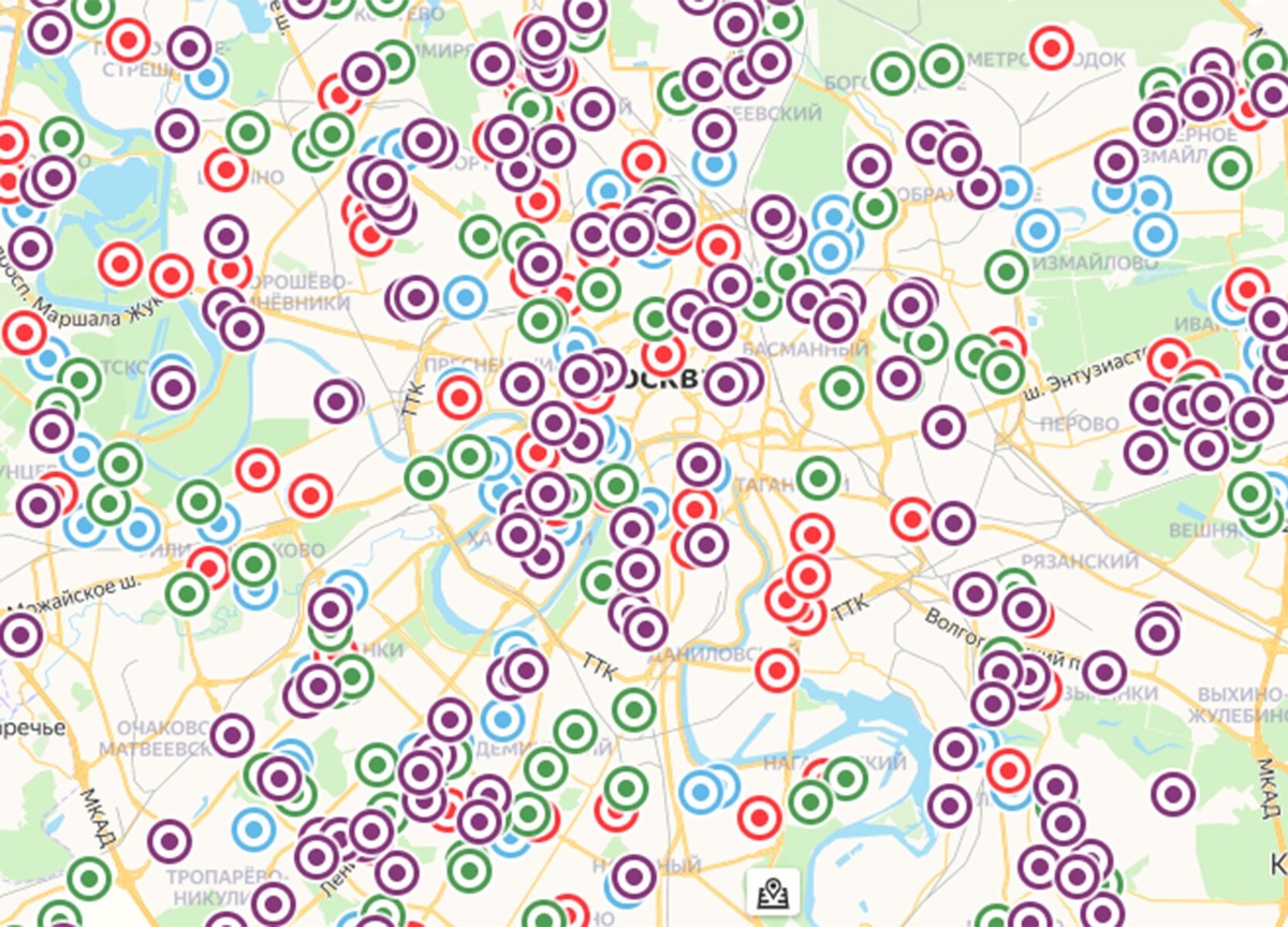 Telegram-канал Mash обновил карту распространения коронавируса в Москве, добавив данные за 1 апреля. Адреса, по которым были выявлены новые случаи заражения, обозначены фиолетовыми метками. Также на карте отмечены дома, откуда госпитализировали инфицированных в предыдущие дни: данные за 24 марта обозначены синими точками, за 25-27 марта — красными, а с 28 по 29 марта — зелеными. Как следует из данных Mash, больше всего новых случаев выявлено на севере и в центре столицы, меньше всего — в восточных, южных и западных районах. По последним данным, число заразившихся коронавирусом в Москве приблизилось к двум тысячам и составило 1880 человек. 267 случаев инфицирования были зарегистрированы за минувшие сутки. Всего в России по состоянию на 1 апреля зафиксировано 2777 случаев заражения коронавирусом в 75 регионах.