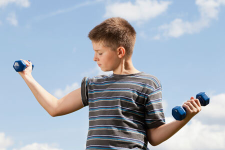 Считается, что упражнения с гантелями (весом не более 1,5 кг) разрешаются подросткам с 14–15 лет, и то при условии, что их выполняют в положении "лежа на спине", но ни в коем случае не стоя или сидя. Единственный допустимый способ подкачать мышцы мальчику 12–13 лет — использовать в качестве тренажера вес собственного тела, выполняя отжимания, подтягивания, всевозможные висы на перекладине. Впрочем, и в 16–18 лет именно они, а не тренировки с грузом, должны составлять основу занятий.