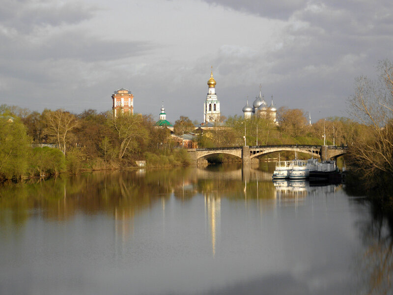 Река в Вологде так и называется Вологда и при том, что имеет смешной размер, судоходна. Высокая вода, тихое утро, главный корпус ВоГТУ.