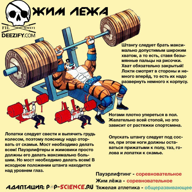 1. Жим штанги лежа на горизонтальной скамье 3×10-12