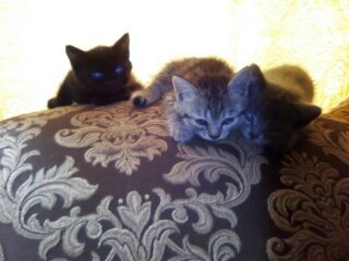 Суббота. Был дождливый осенний день. Смеркалось. Возвращалась домой. На пустыре, недалеко от дома, услышала жалостливое пищание котенка. В темноте ничего не разглядела. Зашла в дом, подхожу к мужу. - Представляешь Саш, опять какие то изверги, выкинули котенка. - Где? - Да вон там, на пустыре, где-то в темноте пищит.. Сашка, не долго думая, вскочил из-за компа, и в чем был, в том и побежал на улицу под дождь. Забегает, в руках два котея, серый и полосатый. Сидим, разглядываем находку.. Через пару минут, слышим на улице, еще более громкий писк.. Говорит: - Дай фонарик, там наверно ещё один! Убежал с фонариком. Вернулся с черным, писклявым комком: - Громкий зараза. А что ж ты сразу не мяукал? А как один остался, не такой смелый стал?.. Дак ещё и черный, не видно в темноте его. Ну уж этого "черномазого", точно пристроим - пацан! - Да кому он нужен? У матери и так двое черных, от третьего она откажется. - Ну, у меня на работе напарник спрашивал про черного котенка. А нет, так Эдику мо