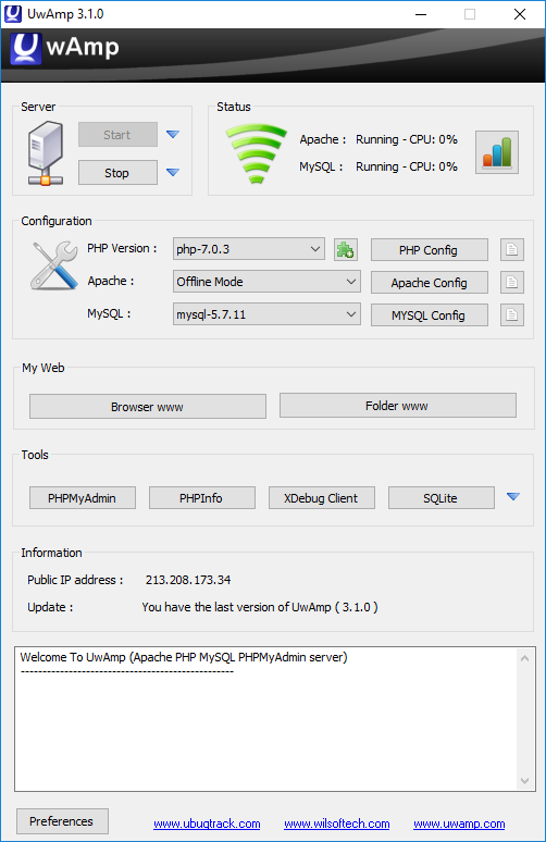 Иметь WordPress на своем компьютере нужно для многих целей. В этой статье посмотрим, как быстро и легко установить WordPress. 1. Запустить веб-сервер UwAmp Для установки WordPress нам потребуется веб-сервер. Самый простой способ — это использовать Uwamp. Он не требует установки и его просто надо запустить. Он входит в сборку PHP-экспресс. Запускаем командой c:\Prog\UwAmp\UwAmp.exe 2. Создать базу данных для WordPress Для работы WordPress необходимо создать базу данных, в которой будут храниться данные сайта. Нажимаем на кнопку «PHPMyAdmin» на панели UwAmp. В панели авторизации введите: Пользователь: root