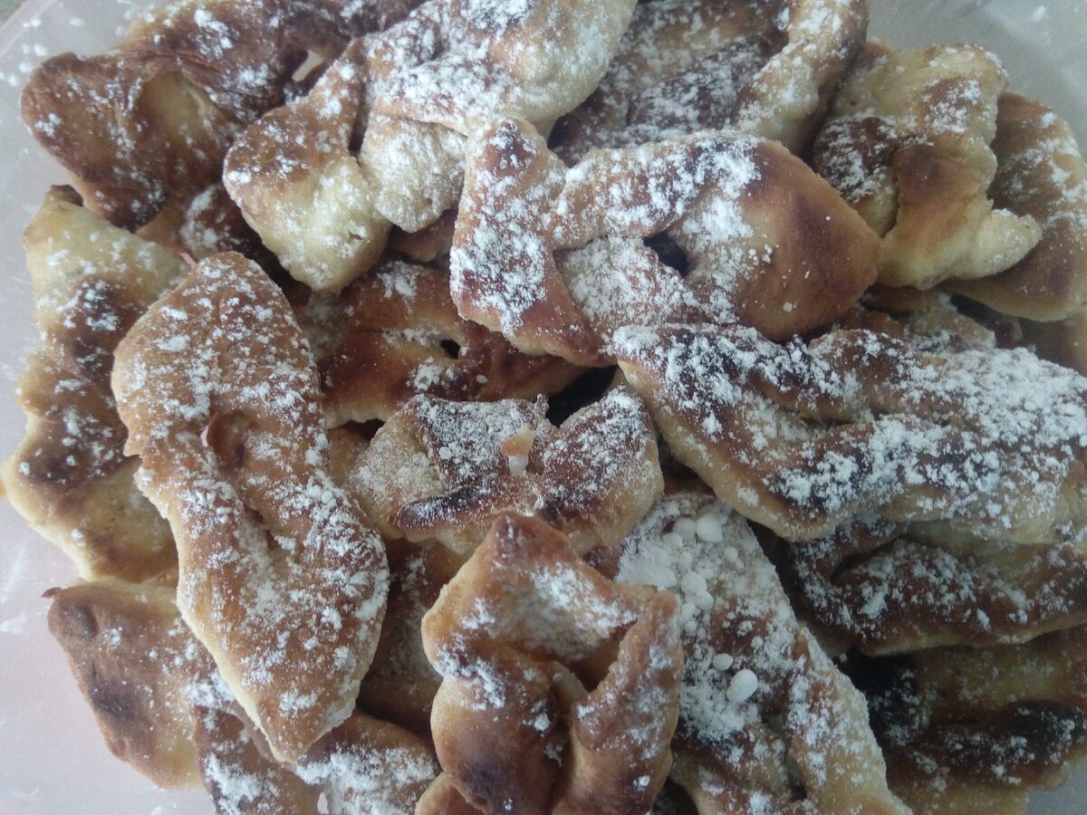 Сегодня хочу поделиться с Вами рецептом «Хворост на сметане». Хворост получается очень вкусный, хрустящий. Детки будут просто в восторге. Вам обязательно стоит попробовать их приготовить. Ингредиенты: 1. Яйца – 3 шт. 2. Сахар – 0,5 ст. 3. Сметана – 200 г. 4. Сода – ½ ч.л. 5. Мука – 3-3,5 ст. 6. Сахарная пудра для посыпки. 7. Растительное масло для жарки. Пошаговый фото рецепт. 1. Яйца и сахар взбить однородного состояния. 2. Добавить сметану и соду. Соду гасить не надо, за счет кислоты сметаны, она погасится в тесте. Перемешать. 3. Муку вводим постепенно, просевая через сито. 4. Замесить тесто не липнущее к рукам. 5. Разделить тесто на 3 части. Каждую часть раскатываем толщиной 0,5-0,7 см. 6. Нарезаем удлиненные ромбики. 7. Делаем посередине каждого ромбика разрез. 8. Затем в этот разрез пропускаем один из уголков теста и выворачиваем наружу. Получается вот такая косичка. 9. Наливаем растительное масло в небольшую кастрюльку либо сковороду с толстым дном. Нужно раскалить мас
