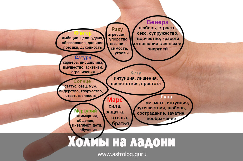 Сила и качество планет в гороскопе могут быть определены по качеству и форме холмов на ладонях человека, а также по знакам на этих холмах. Левая рука показывает карму по рождению, а правая рука показывает наработки в этом воплощении. Вот основные сферы жизни, которые можно рассматривать по холмам: • Холм Юпитера (под указательным пальцем) – образование, учителя, удача, авторитет, цели, амбиции и их реализация, духовность, дальние путешествия; • Холм Сатурна (под средним пальцем) – работа, карьера, аскетизм, ограничения, имущество, дисциплина, супружеская верность, серьёзность, ответственность за себя; • Холм Солнца (под безымянным пальцем) – социальный статус, известность, отец (левая рука), муж (правая рука), оптимизм, счастье, лидерство, творчество, ответственность за других; • Холм Меркурия (под мизинцем) – общение, коммерция, интеллект, логика, обучение, дети, дяди, общительность, дипломатия, организаторские способности, здоровье, недалёкие путешествия; • Холм Марса (ребро ладони)