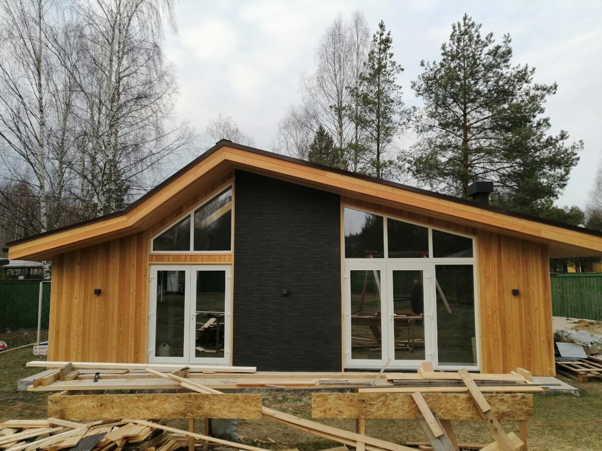 Отделка фасада - разноширокая вагонка штиль из лиственницы, вставки под камень из японских фиброцементных панелей Ничиха.