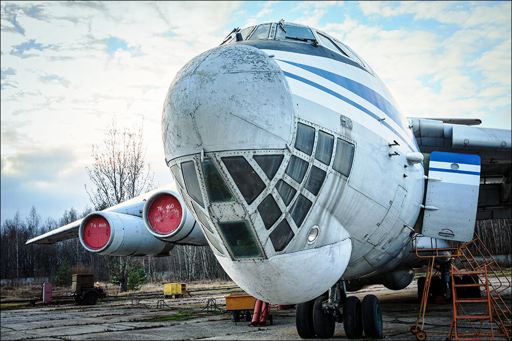 В предыдущих постах я рассказал о самолетах Ил-86 и Ту-154М, которые служат "живыми" учебными пособиями для студентов МГТУ ГА и хранятся на удаленной стоянке в лесу неподалёку от Шереметьево. Ну а теперь совсем иной аппарат - Ил 76T. Это большой транспортный самолет, в первую очередь созданный для военных задач. Первый пробный полет 76-й выполнил в далёком 1971-м году с Ходынки. Этот аэродром находился неподалеку от метро "Аэропорт", практически в центре Москвы. Серийные же самолёты начали летать с 1974 года. Самолет начал создаваться в ОКБ Ильюшина в конце 60-х. по заказу Минобороны как универсальный транспортник, предназначенный, впрочем, для перевозки вполне конкретных типов боевой техники, и десантирования с рампы. Это определило массу, габариты и другие ТТХ, а также возможность работы с грунтовой ВПП, относительно короткий разбег и пробег. Отсюда - ряд уникальных решений: шасси высокой проходимости с большим количеством колес, эффективная механизация крыла, тяга двигателей "с за
