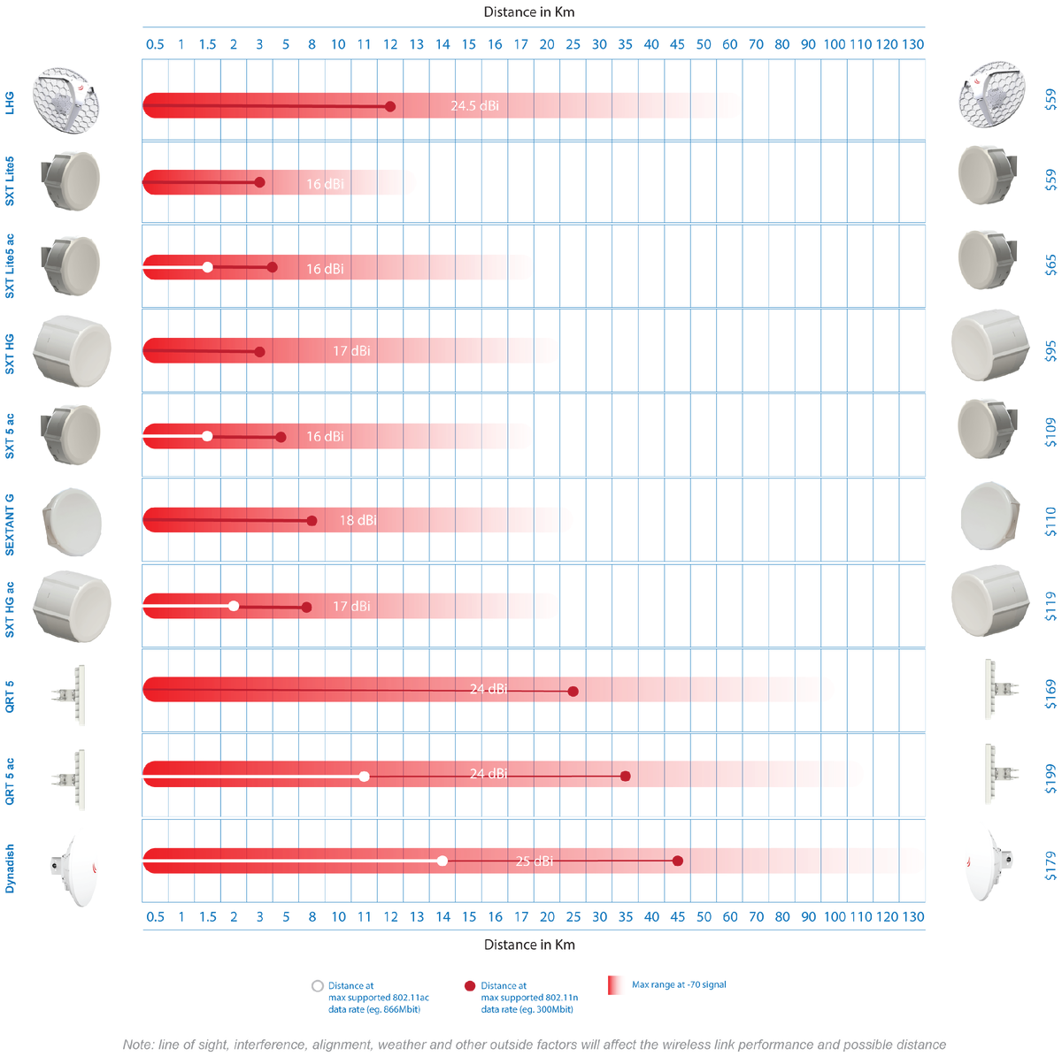 Сравнительная таблица дальности и мощности точек доступа компании MikroTik