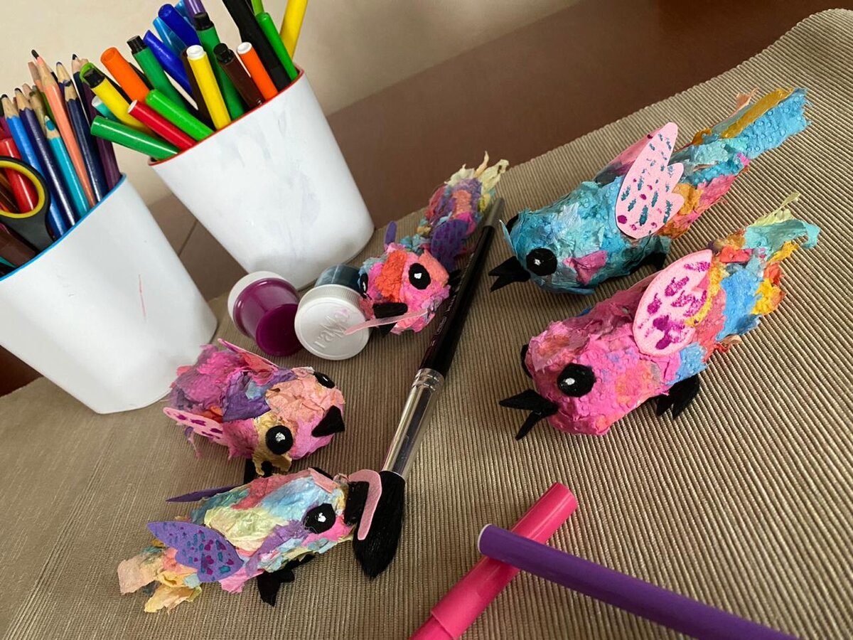 Между прочим – весна, пусть мы её и наблюдаем пока только из окна🌱🌤 Почему бы не устроить себе и детям весеннее настроение? И заодно сделать кое-что милое для украшения квартиры ⭐Для вас – мастер-класс по изготовлению симпатичных птичек)) Участвует вся семья! ⠀ ✅Вам нужны: ✔Фольга ✔Салфетки или бумажные полотенца ✔Акварель ✔Клей ПВА ✔Опционально – цветная бумага, фетр, пластилин, бусины… ⭐Шаг 1. Заготовка Отрываем кусок фольги и мнем-жамкаем так, чтобы придать фольге каплевидную форму. Это – туловище для птички. Круглый широкий конец – голова. Заострённый – хвост. ⠀ ⭐Шаг 2. Перья Вооружаемся кисточками и раскрашиваем бумажные полотенца в самые разные яркие цвета. Учтите, что акварель отлично расплывается, в этом её плюс и минус 🎨Плюс: плавные эффектные переходы. Минус: после высыхания краски могут бледнеть, так что старайтесь раскрасить листы поярче. Отправляем сохнуть)) Как только бумага высохла – дружно рвём её на небольшие чуть вытянутые кусочки. Это будут пёрышки. ⭐Шаг 3. Клеим