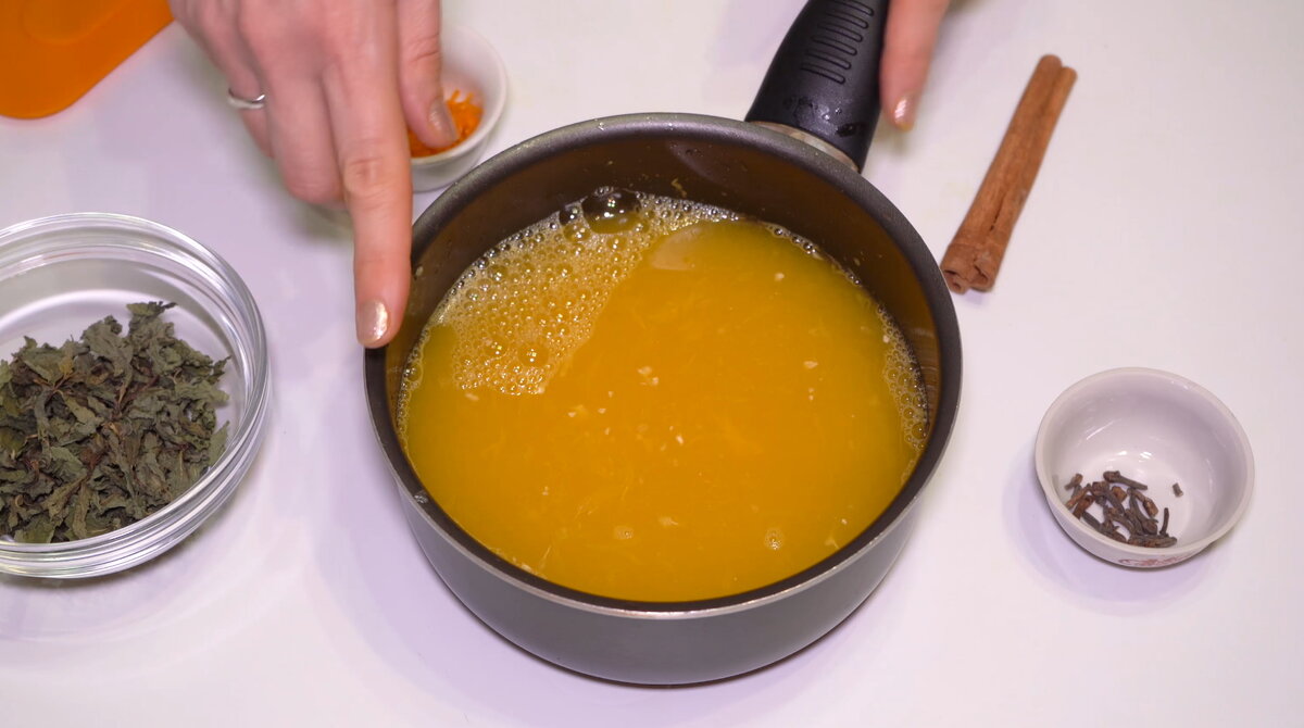 Как укрепить иммунитет? Попробуйте Очень Вкусный и полезный имбирный напиток с апельсинами, который я готовлю для моих родных в любое время года. Рецепт приготовления этого имбирного напитка легкий и доступный для всех. Сочетание ИМБИРЬ, АПЕЛЬСИНЫ, МЕД - это всегда доступно и полезно. ИНГРЕДИЕНТЫ ПОШАГОВЫЙ РЕЦЕПТ Снимаем цедру 1-го апельсина и натираем на мелкой терке корень имбиря (большой кусочек или по меньше, по желанию). Выжимаем сок из апельсинов. Выжимки не выбрасываем. Добавляем в апельсиновый сок палочку корицы, гвоздику – 5-6 бутонов, немного сушеной мяты и цедру апельсина. Отправляем сотейник на плиту. Нужно довести апельсиновый сок до кипения, но при этом ни кипятить. Снимаем сок с огня и даем настояться. Добавляем в остывший сок с пряностями натертый корень имбиря. Нарезаем выжимки, перекладываем в кастрюлю и заливаем водой. Добавляем 2 ст.л. сахара и пол ч.л. молотой корицы. Перемешиваем и варим 15 минут после закипания. Остужаем отвар из выжимок до комнатн