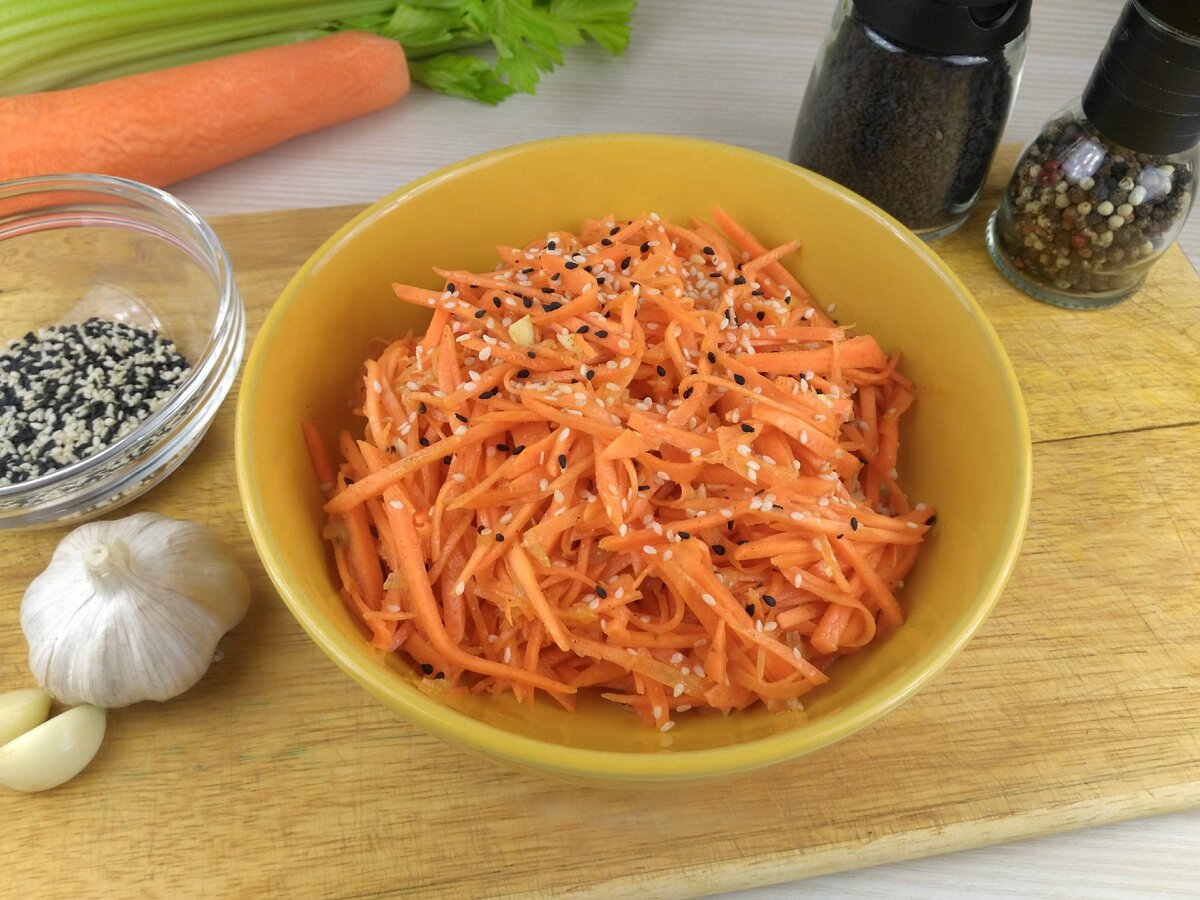 Морковь нарежьте тонкой соломкой, добавьте сахар, соль и уксус. Перемешайте и оставьте на 10-15 минут. Если образуется сок – слейте его.