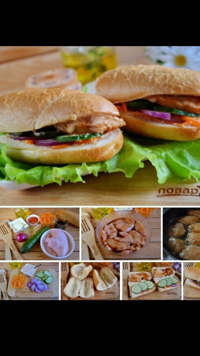 Здравствуйте дорогие подписчики и читатели моей вкусной и сладкой странички снова с вами я Ирина! Сегодня я хочу поделиться с вами рецептом,,Бан Ми" Для приготовления нам понадобятся следующие ИНГРЕДИЕНТЫ✏ ✅Багет — 1 Штука ✅Куриное филе — 400 Грамм ✅Соевый соус — 3 Ст. ложки ✅Мед натуральный — 1 Чайная ложка ✅Соус чили — 3 Чайных ложки ✅Огурец свежий — 1 Штука ✅Маринованная морковь или дайкон — 100-150 Грамм ✅Майонез — 3 Ст. ложки ✅Зелень — По вкусу ✅Растительное масло — 2-3 Ст. ложек ✅Лук салатный — 1 Штука (белый или фиолетовый) Приступаем к приготовлению 👩🍳👨🍳 1. Подготовьте продукты согласно списку. Приступим! Куриное филе и огурец нужно вымыть, лук очистить от шелухи. 2. Первым делом замаринуйте мясо. Для этого порежьте куриное филе на небольшие кусочки. Приготовьте маринад из соевого соуса, 1 ложки соуса чили, ложки меда. Опустите мясо в маринад, перемешайте и оставьте при комнатной температуре на 30 минут. 3. Разогрейте растительное масло на сковороде и обжарьте мясо
