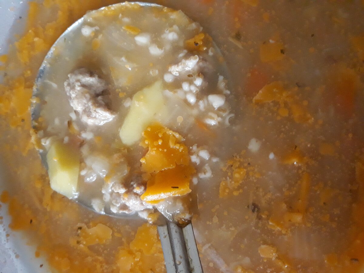 Вчера готовила наш любимый суп с фрикадельками. Этапы отснять не успела, но, думаю, это так просто, что можно передать текстом. Подруга угостила этим супом и теперь он наш бессменный фаворит. Суп с фрикадельками- это вкусно всегда, но этот еще и полезен. Потому, что это суп с овсяными хлопьями. И так: ставлю на плиту кастрюлю с водой, подсаливаю, и, пока она нагревается скатывают из немного подсоленого мясного фарша маленькие, " на один укус" фрикадельки и сразу бросаю их в воду. Пока вода не прогреется- не перемешиваю, чтобы они не развалились. Чищу и режу на небольшие кубики картофель. На глаз- количество картофеля примерно как количество фарша или поменьше. И тоже бросаю в кастрюлю( к этому времени вода уже закипает). Когда вода закипит- добавляю примерно горсть сухих овсяных хлопьев( объем воды около 2 л). Перемешиваю и пусть оно варится. Параллельно с этим( можно и привлечь кого- нибудь в помощь, но быстро и самому получается) чищу среднюю морковку и луковицу( не маленькую). Ре