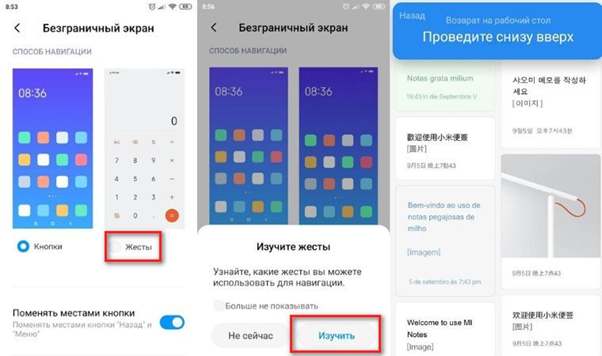 На смартфонах Сяоми есть возможность воспользоваться двумя вариантами управления: с помощью управляющих кнопок либо жестов пользователя. В первом случае используются стандартные клавиши «Домой», «Назад» и «Меню». Во втором речь идет о безграничном экране – это означает, что на дисплее полностью отсутствуют какие-либо кнопки управления. О том, как активировать и настроить функцию, мы расскажем в статье. Включение опции Сначала нужно зайти в «Расширенные настройки» и выбрать пункт «Безграничный экран». На дисплейном модуле отобразятся два варианта навигации. Выбираем второй способ, для этого надо кликнуть на подпункт «Жесты». Инструкция по использованию Особенность опции заключается в том, что становятся доступными жесты, которые заменяют собой стандартные управляющие клавиши. При активации функции телефон Xiaomi предложит воспользоваться инструкцией, которая поможет освоиться с навигацией. Вы можете выбрать «Не сейчас» либо «Изучить». Предполагается, что жестами можно