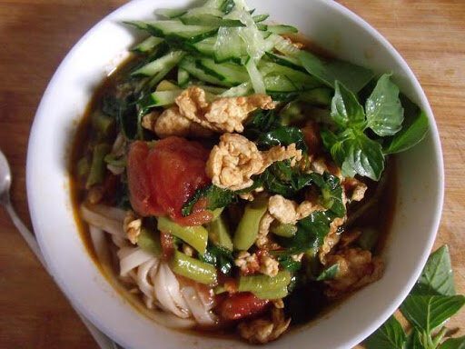 Ингредиенты: Количество ингредиентов зависит от размера порции. Готовка: Фасоль нарезать на кусочки Лук- полукольцами Помидор- кубиками Огурец пропустить через терку А также нарезать амарант, шизонипету (базилик) Нагреть сковороду/вок, влить небольшое количество масла, разбить яйцо, поджарить, перемешивая в процессе и выложить. Разогреть сковороду/вок, добавить масло, и обжарить помидор, далее добавить лук. Почувствовав аромат, влить воду и довести до кипения. Затем добавить ранее обжаренное яйцо, а также амарант, шизонипету (базилик), и соль по вкусу. Выключить огонь и дать остыть. Затем добавить еще воды и довести до кипения, добавить лапшу, варить 7-8 мин, и готово. И готово! Подача: Приятного аппетита [ 慢慢吃~]