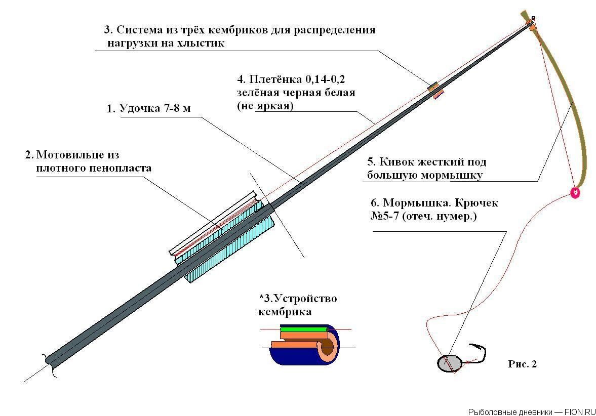 Ловить летом на кивок не просто результативно, но и своеобразно. Если рыбы нет на одном участке, то перемещаешься на другой, находясь в постоянном поиске и движении. Снасть Оснастка на ловлю рыбы с кивком достаточно проста и имеет всего три детали: кивок,леска и мормышка. Леска подбирается, как обычно, под предполагаемый размер вылавливаемой рыбы. Мормышку же выбирают с таким расчетом, чтобы протягивала леску и привлекала подводных обитателей. Кивок располагается чуть ниже по вершинке удилища, чем стопорная трубочка, которая одевается первой и держит всю оснастку. Еще не было случая, чтобы рыба вырвала оснастку и скрылась с ней, колечко очень хорошо фиксирует её на вершинке удилища. Вершинки у удилищ разные, и трубочки-фиксаторы так же. Необходимо иметь на разные удилища для разных оснасток. Тактика ловли Бывалые рыболовы при ловле на кивок с мормышкой на протяжении многих лет подметили, что рыба, первым делом, обращает внимание на движущуюся насадку, в подавляющем большинстве с