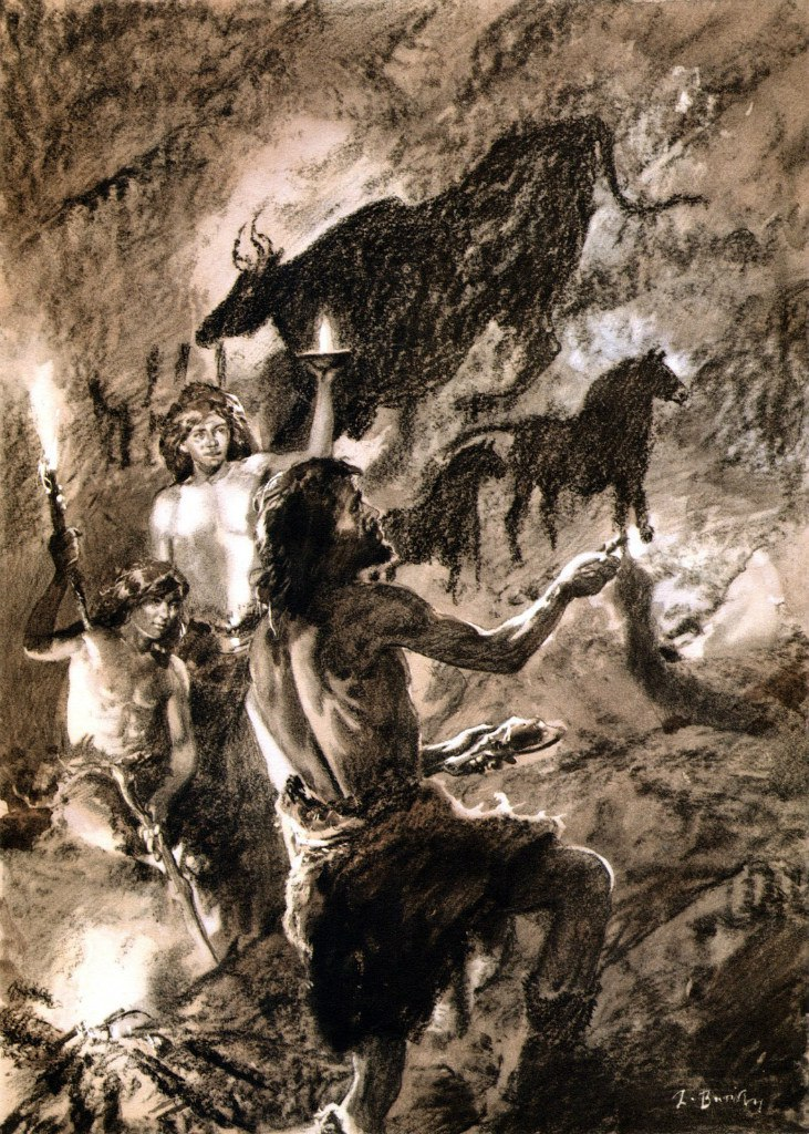 Первый конфликт Безмозглый - сын хромого и волосатой, отступил на шаг от стены пещеры и удовлетворенно хмыкнул, окинув взглядом нацарапанную им сцену охоты на мамонта... Много лун он пробирался сюда тайком от Громогласного, пренебрегая своими прямыми обязанностями собирать коренья и очищать скребком шкуры. Это была работа для самок и настоящему охотнику такая работа была бы позором, Но что поделать, он и так был позором своего племени, тщедушный и глупый, родившийся в голодную пору белого безмолвия.Он выжил каким-то чудом, но был хилым; не умел быстро бегать; имел слабый нюх и зрение. Да к тому же определенный за бесполезность в охоте к собирательницам, он и эту работу не мог выполнять хорошо, поскольку постоянно подбирал красящие камни и расчерчивал ими любые гладкие поверхности которые попадались ему на пути. Получив от вожака последнее предупреждение, он стал это делать тайком… И вот его последняя работа удалась: фигурки охотников, окружившие мамонта, выглядели как живые. Несомн