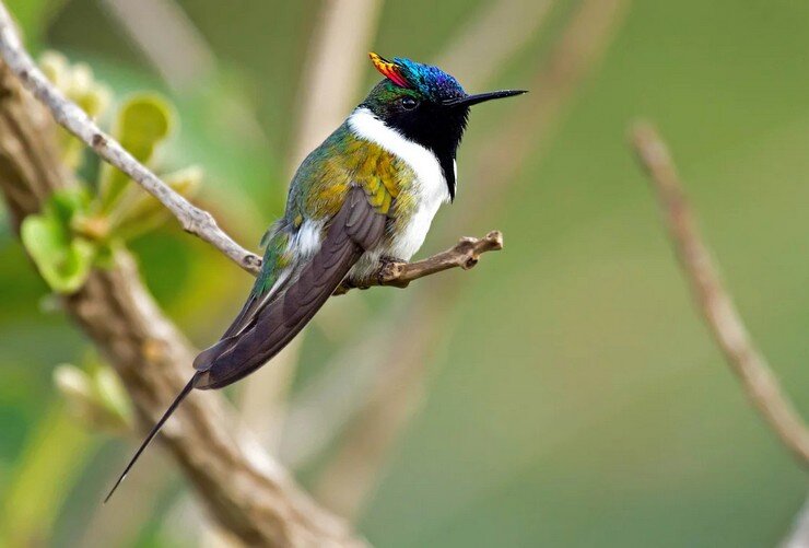 Самые крупные представители рогатых колибри – не более 12 см от клюва до кончика хвоста. Рога из ярких перьев бывают только у самцов. Белобрюхие с черными манишками. Одни из самых мелких птиц в мире незаметны в листве из-за желто-зеленого оперения, белое брюшко, темная манишка, заостренный хвост – особенности вида, встречающегося только в нескольких странах Южной Америки: Боливии, Бразилии и Суринаме.