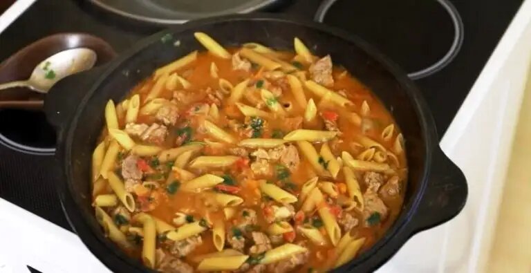 Изюминка рецепта в том, что готовить макароны в будете в том же соусе, в котором готовили мясо – поэтому расход продуктов получится минимальный. Для приготовления вам потребуются такие ингредиенты: — баранина, 500 г; — макароны, 400 г; — лук и морковь по 1 шт; — помидоры, 2 шт; — чеснок, 34 зубчика; — петрушка и укроп, по пучку; — соль, перец, масло растительное, специи к мясу. Процесс приготовления Мясо реем кусочками и обжариваем на растительном масле, перемешивая, под крышкой. Совет: вместо баранины вы можете брать любое другое мясо. Лук режем кубиком и морковь – соломкой, зелень рубим. Добавляем сначала к мясу лук, перемешиваем, потом морковь. Добавляем соль, перец и специи по вкусу. Совет: если вся жидкость с мяса уже испариться и мясо начнет пригорать, добавляем немного воды. Добавляем кусочки помидор и тушим под крышкой, иногда перемешивая. Добавляем зелень и мелко рубленый корень петрушки. Тушим пару минут и увеличиваем огонь, всыпаем макароны. Если воды очень мало, добавляем и