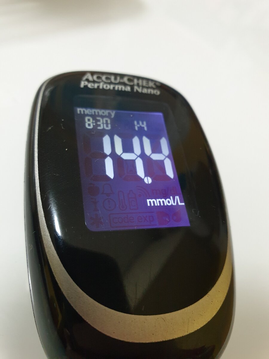 Перед завтраком у меня сахар был 14,4 ммоль/л. Связано это с тем, что организму перестало хватать длинного инсулина. На завтрак я съел овсянку и выпил чашку кофе. Овсянка была быстро заваривающиеся 40 грамм. В 40 граммах содержится 2,5 ХЕ. Кофе я посчитал на 0,5 ХЕ. Из- за большого сахара я поставил на 3 единицы инсулина больше.