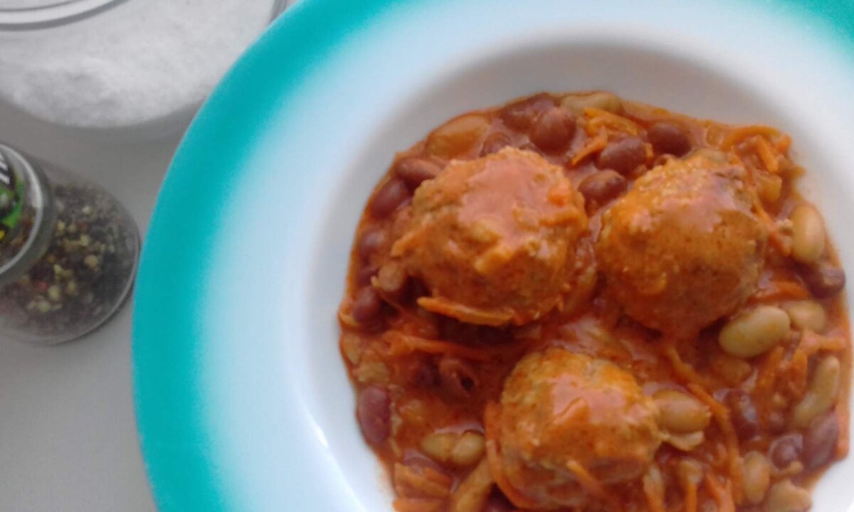 1. Морковь и один лук очистить, нарезать, потушить на растительном масле. Соединить с белой и красной фасолью без жидкости, перемешать. 2. В фарш добавить замоченный в молоке кусочек хлеба , яйцо, мелко нашинкованный лук, посолить, приправить и перемешать. Сформировать тефтельки, обжарить. 3. Сметану с томатной пастой посолить и поперчить, перемешать. 4. В кастрюлю выложить смесь из фасоли, лука и моркови. Сверху положить тефтельки. Залить соусом. Довести до кипения и тушить на небольшом огне 10 минут. Приятного аппетита!!!