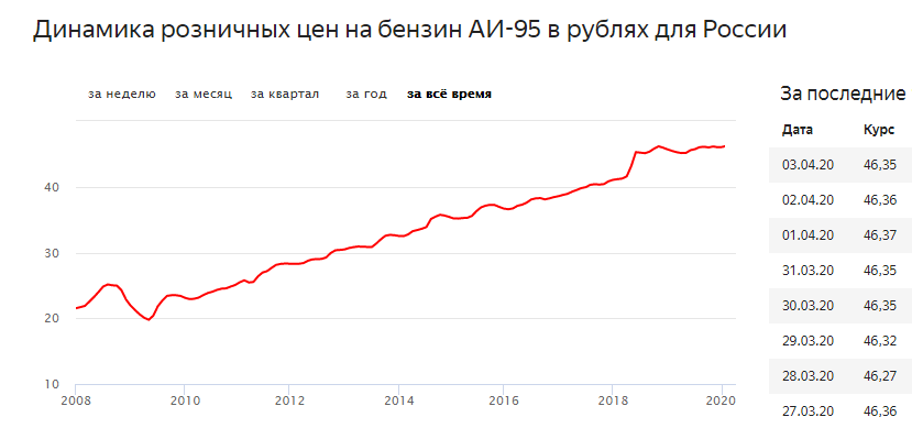 Доступность топлива волнует не только рядовых автолюбителей всего мира. Топливо - ключевой элемент, стоящий в начале множества экономических цепочек и его стоимость закладывается в потребительскую цену огромного количества продуктов и услуг. Стоимость нефти на международных рынках за два месяца упала более чем в два раза, что стало большой радостью всех автомобилистов в странах с работающими рыночными механизмами, ведь стоимость производства бензина тоже упала, пусть и не так сильно. Вопрос чем и на какую сумму заправиться, конечно, волнует и россиян, но в России давно перестали удивляться тому, что движения на мировом рынке энергоносителей никаким образом не влияют на внутренние цены на бензин. Нефть дорожает - бензин дорожает, нефть дешевеет - бензин снова дорожает. Для сравнения, динамика цены на бензин в России и США. стоимость литра бензина в России по годам За прошедшие годы цена нефти несколько раз сильно снижалась, но бензин в России стабильно продолжал дорожать даже в эти мом