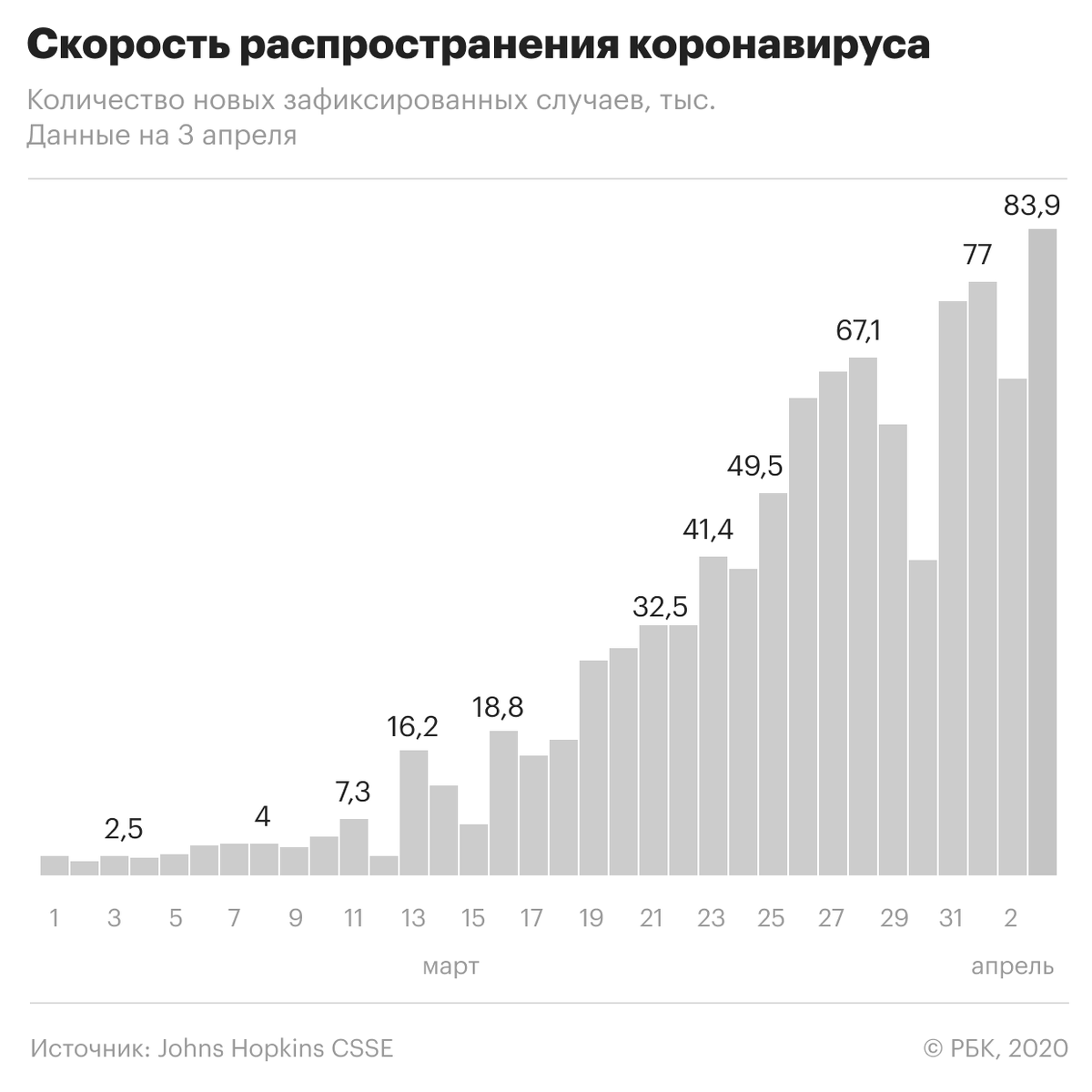 Лидером по числу подтвержденных случаев, по данным Университета Джонса Хопкинса, остаются США (277,7 тыс.). Италия находится на втором месте (119,8 тыс.), Испания — на третьем (119,1 тыс.), Германия (91,1 тыс.) — на четвертом. Китай, где началась пандемия, откатился на пятое место по числу случаев заражения (82,5 тыс.; 76,9 тыс. человек уже выздоровели).