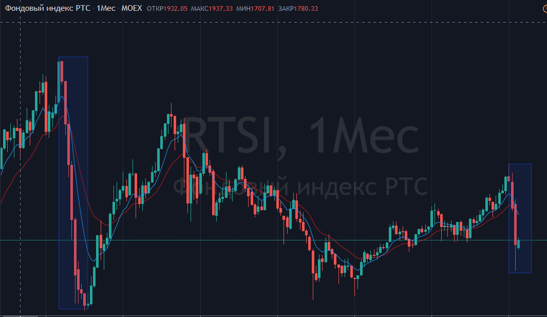 Приветствую читателей и подписчиков! Не много удивляюсь панике охватившей трейдерское сообщество, притом даже опытные трейдеры почему-то позволяют себе высказывания типа "такого огромного падения никогда не было и не будет". И было и будет)) Нет ничего нового под солнцем. RTSI (Фондовый индекс РТС)- месячный график С левой стороны графика события с июня 2008 по январь 2009, с правой 2020 год. Вы сами можете посмотреть на динамику и увидеть что волатильность и сила падения примерно одинаковые. Да, любому грамотному трейдеру понятно, что это еще не конец. И как только вирус будет побежден, всплывут экономические проблемы и рынки просядут "к бабке не ходи". Но только не надо паниковать, обвалы (кризисы) были раньше и будут в будущем. Важно сохранять "трезвое" мышление и рассматривать ситуацию как возможность. Ну и никуда без моего любимого графического анализа, хочу вам показать одну забавную вещь, и забавность ее как раз в том, что происходящее сейчас на рынке вписывается в классическо