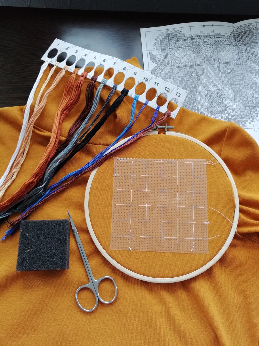🔸сначала пришлось повозиться с расположением вышивки. Концептуально - на груди слева, но где именно она должна быть, чтобы выглядела наиболее органично? Момент ответственный. Искала ответы в интернете: обычно отмеряется расстояние от швов (плечо, рукав) и/или середины вещи. Есть даже определенные интервалы, сколько конкретно см нужно отмерить. Но я девушка худенькая, с такими цифрами мой медведь оказался бы посередине водолазки 😅 Поэтому я просто надела ее и закрепила канву "на глаз". Надеюсь, мой глаз меня не подвёл 😉