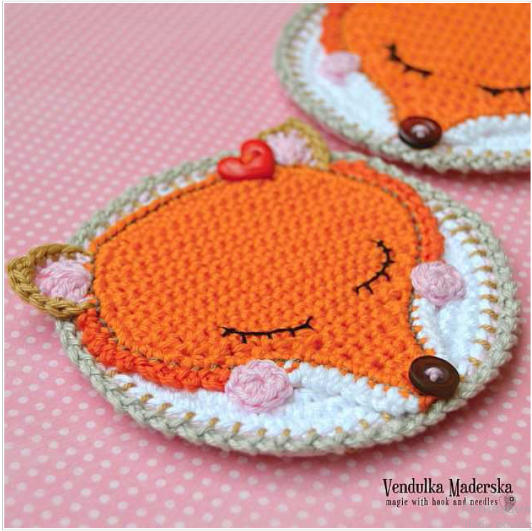 Автор - Вендула Мандерска. Перевод - Вязальные приключения. Условные обозначение: ВП - воздушная петля (RO) СС-соединительный столбик (PO) СБН - столбик без накида (KS) ССН -столбик с 1 накидом (DS) ПР - прибавка (V) УБ - убавка Материалы: 100% хлопок, цвета: оранжевый, белый, немного: темно-оранжевый, светло-розовый, верблюжий, цвет льна. Крючок: 3мм Размер готового изделия 11,5 см Процесс вязания: Подставка под горячее состоит из из двух частей: подставки и аппликации лисы. Вяжем лисичку. Начало: связать оранжевой пряжей 14 вп. 1 ряд: Со второй петли 13 СБН, ВП в конце ряда, повернуть вязание 2 ряд: ПР, 11 СБН, ПР (15), ВП, повернуть вязание 3 ряд: ПР, 13 СБН, ПР (17), ВП, повернуть вязание 4 ряд: ПР, 15 СБН, ПР (19), ВП, повернуть вязание 5 ряд: вяжем СБН в каждую петлю ряда (19 СБН), ВП, повернуть вязание 6 ряд: ПР, 17 СБН, ПР (21), ВП, повернуть вязание 7 ряд: вяжем СБН в каждую петлю ряда (21 СБН), ВП, повернуть вязание 8 ряд: ПР, 19 СБН, ПР (23), ВП, повернуть вяза
