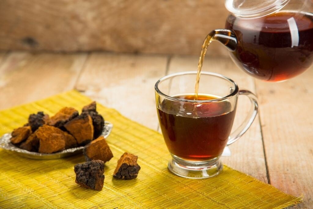 Чай из чаги для профилактики онкозаболеваний и при сердечно-сосудистых заболеваниях. Горсть сухой чаги запарить 2 стак. кипящей воды и дать закипеть. Поместить на паровую баню еще мин. на 15-20, настаивать, пока отвар не приобретет красноватый оттенок, процедить. Пить как чай, добавляя мед, теплым в течение всего дня.