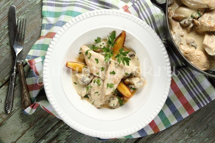 3. Через полчаса достать курицу из кастрюли, к сидру с бульоном добавить сметану и довести до кипения. Затем снова вернуть курицу в соус, посолить и поперчить по вкусу.