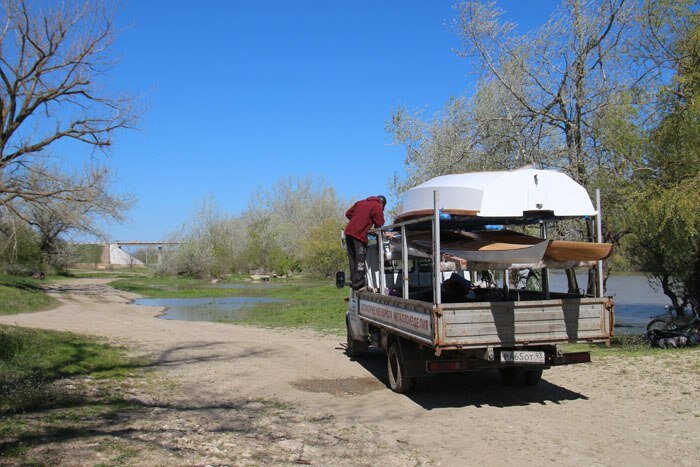 25 апреля 2019 года в составе шести человек мы прибыли на место – к реке Кубань в районе Варениковского моста. Река сильно разлилась, и берег был подтоплен. Но, мы нашли место для спуска на воду, разгрузили «Газель», снарядили швертбот. В этот раз в сплаве участвовало только пять человек, а потому решено было сплавляться лишь на двух каяках и одном швертботе А-15.