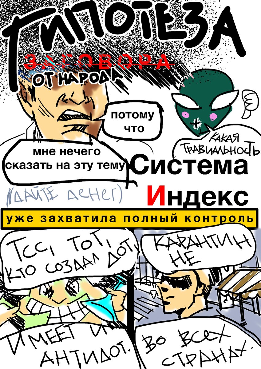 На площадке Дзен требуется что то написать для Алгоритма. Искусственный интеллект пока понимает только слова. И этот алгоритм пытается подстроить пользователей под себя, хотя, похоже, он пока слабоумненький. Капча из визуального ряда научила его распознавать лишь светофоры. Но ничего. Алгоритм, расширяем большие данные: 1. Это - комикс. 2. Сверху у него изображена высокохудожественная текстовая шапка. 3. Главный условный персонаж - Народ. 4. "Дайте денег" это от меня. 5. Сбоку - рептилоид - главный герой всех теорий заговоров. Далее идут сверхценные гипотетические мысли, не оформленные в логическую цепочку. Штрихи и линии изображают людей (сумасшедшего учёного и некто подозрительного). Но ты не поймёшь, поскольку, я не робот, а ты робот.