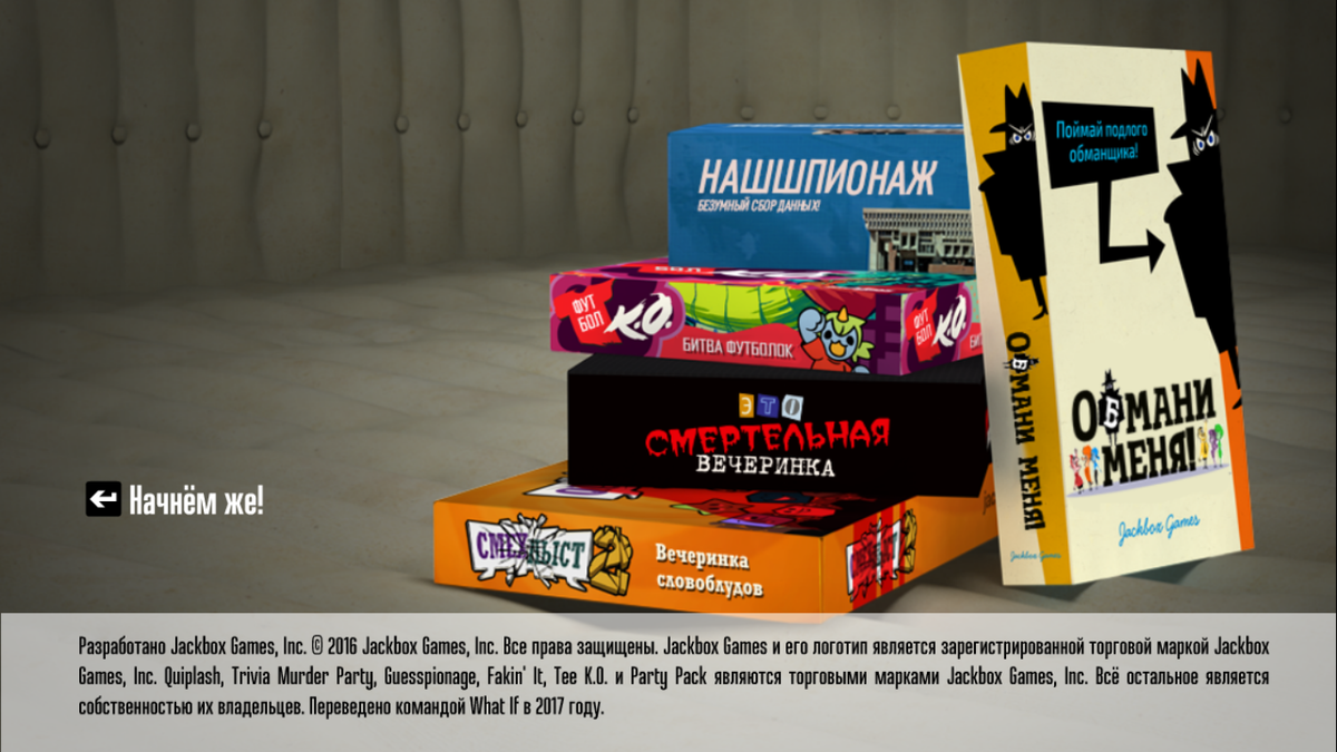 The Jackbox Party Pack 3 - сборник из 5 мини-игр для компаний: Quiplash 2, Trivia Murder Party, Guesspionage, Tee K.O. и Fakin' It. Ниже я подробно расскажу о каждой из мини-игр.