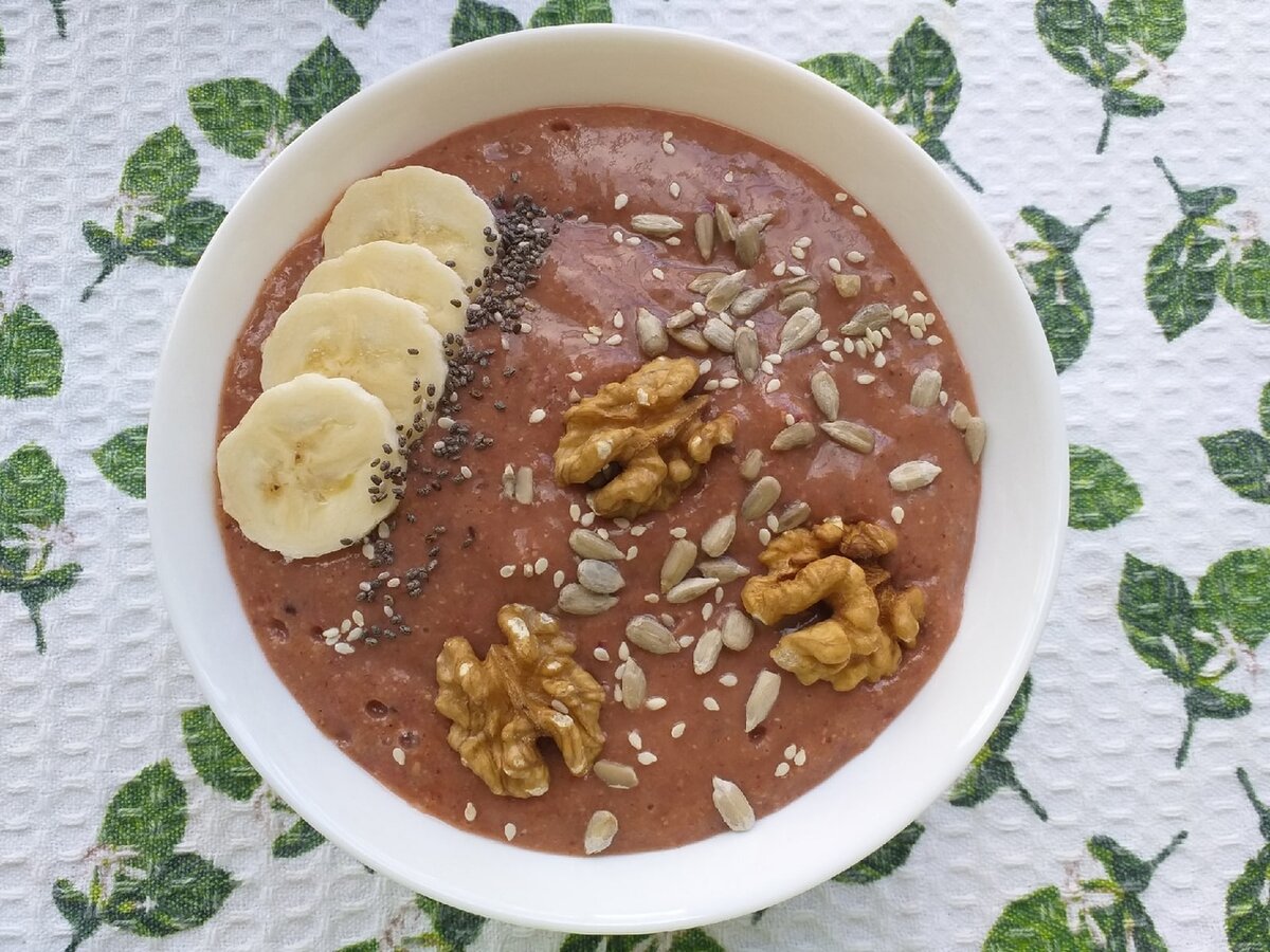 2. Перебиваем все ингредиенты в блендере. Густоту регулируйте по вашему желанию. Я люблю более густой вариант, чтоб есть ложечкой. Можно добавить больше воды и брать с собой на перекус или пить утром, когда нет времени.