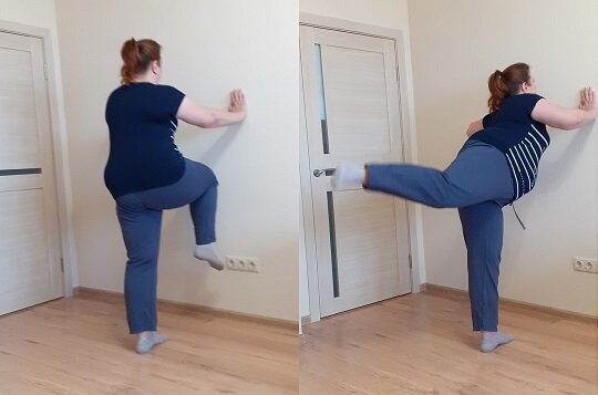 Напоминаю. Я 46-летняя женщина весом 116,4 кг, которая вела сидячий образ жизни, а теперь старается похудеть. Сегодня я решила к моим тренировкам с Лесли Сансон добавить махи ногами. Почему именно махи я выбрала в качестве упражнений для ног? Да потому что мои колени и так с трудом держат мой слоновий вес, и добавлять им нагрузку в виде приседаний, выпадов и т.п. - это слишком жестоко. После этого с коленями можно будет распрощаться. Но какие-то упражнения для укрепления мышц ног нужны, поэтому махи. Упражнения не сложные, я справляюсь. И я призываю тех женщин, кто ещё не начал заниматься своей физической формой, начать делать каждый день любые простые упражнения. Со временем это войдёт в привычку, а Вы будете чувствовать себя лучше. Сегодня я сделала по 10 махов на каждую ногу в каждом упражнении. Немного, но для начала пойдёт. Дальше мои фото и видео. Прошу не смеяться, самой смешно, как это выглядит. )) Первое упражнение. Опора руками на стену (стул, подоконник,что найдё
