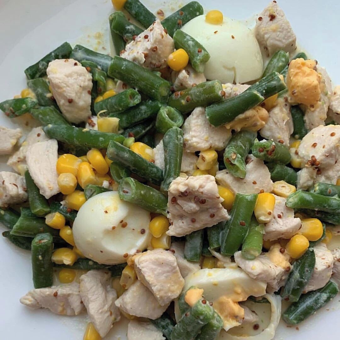 🔹Ингредиенты: - Куриное филе ~150 г - Яйца - 1-2 шт. - Фасоль стручковая ~100 г - Кукуруза консервированная ~60 г - Сметана 10%/либо йогурт греческий -2 ст.л. - Горчица - у меня дижонская зернистая 1 ч.л. - Чеснок - по вкусу 🔹Приготовление: 1. Куриную грудку нарезать на кубики и отварить. 2. Яйца отварить и нарезать кольцами, либо просто измельчить. 3. Стручковую фасоль отварить. 4. Смешать курицу, яйца, фасоль, кукурузу. 5. Для соуса: сметана + горчица ( с зернистой получается прям), можно ещё чеснок добавить. 6. Все ингредиенты смешать с соусом.