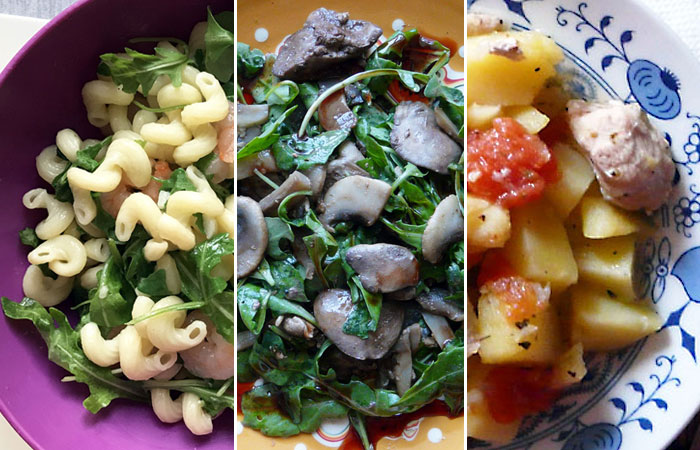 400 г куриной печени; 200 г руколы; 150 г шампиньонов (подойдут также консервированные или вообще любые грибы, которые есть под рукой); Черный перец, соль; Оливковое масло; 1 столовая ложка бальзамического уксуса; Соус Наршараб.